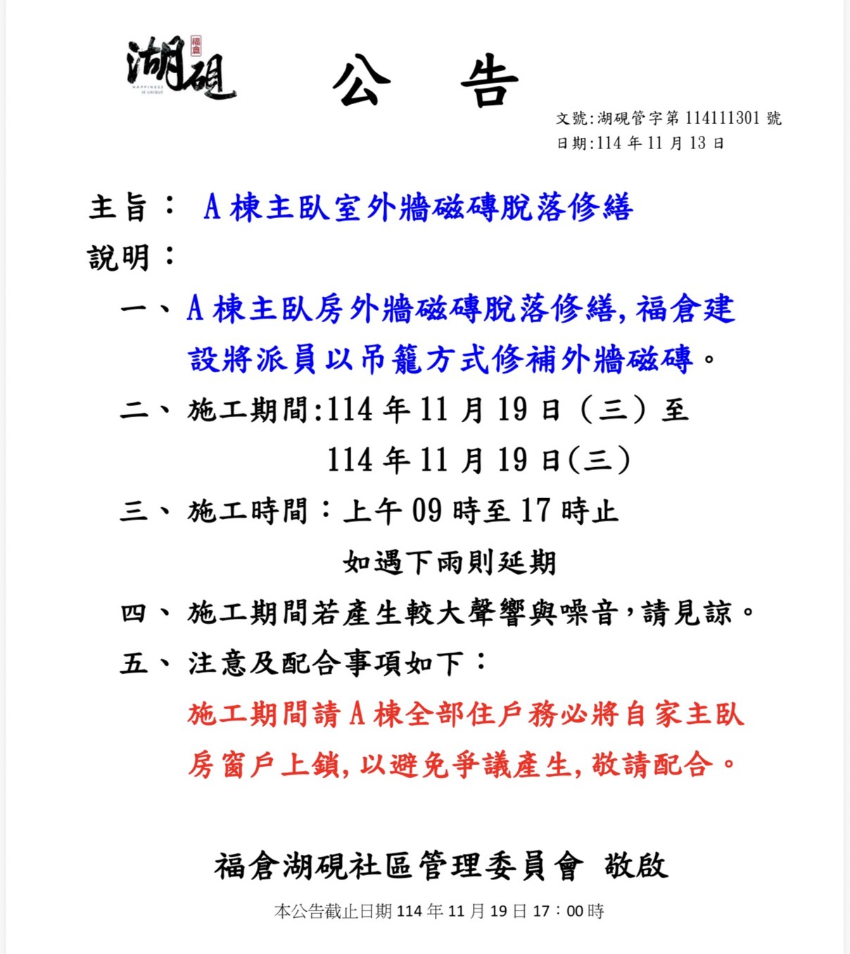 在2025年底,因為我們社區A棟外牆有磁磚脫落,福倉派員協助修補外牆磁磚。